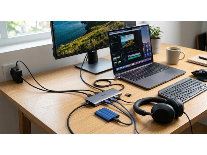 由於 Type-C 內部具備 24 個高密度針腳設計,且具備靈活的雙向通訊能力,它成為了現代擴充基座(Docking Station) 與 Hub 的技術核心。