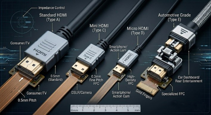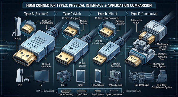 HDMI 連接器完全指南:從 Type A 到 Type E 的物理介面與電氣規格詳解