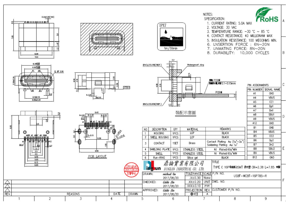 USB TYPE C 16P母座板上SMT 防水型 CH=2.38 L=7.85 四腳 IPX7