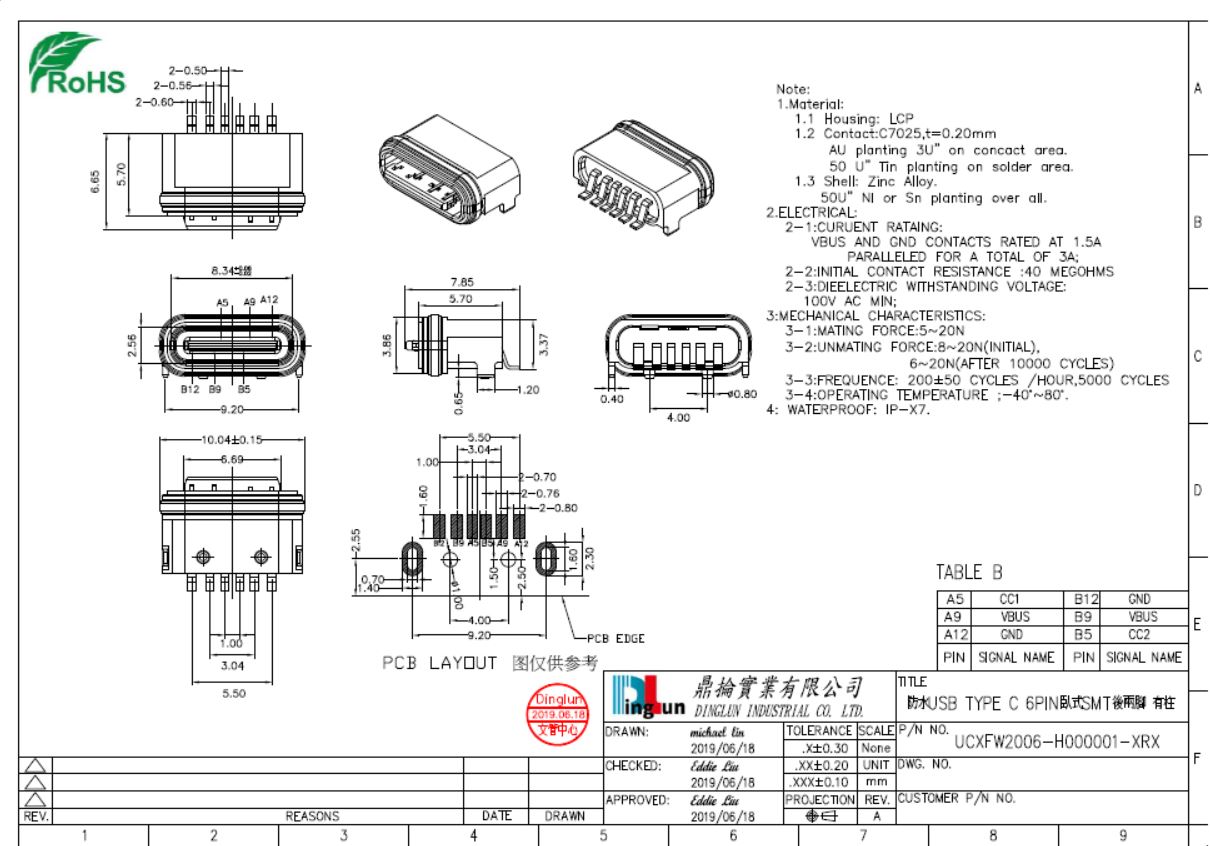 USB 6PIN防水TYPE C母座板上型SMT後兩腳插板,防水IP67 級