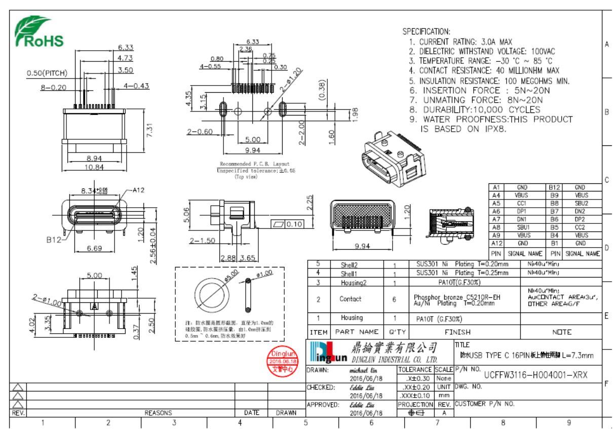 防水USB TYPE C 16PIN板上帶柱兩腳 L=7.3mm