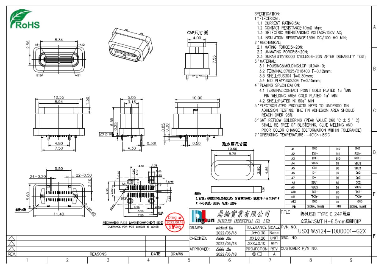 防水USB TYPE C 24P母座立式貼片SMT H=6.5mm 四腳DIP