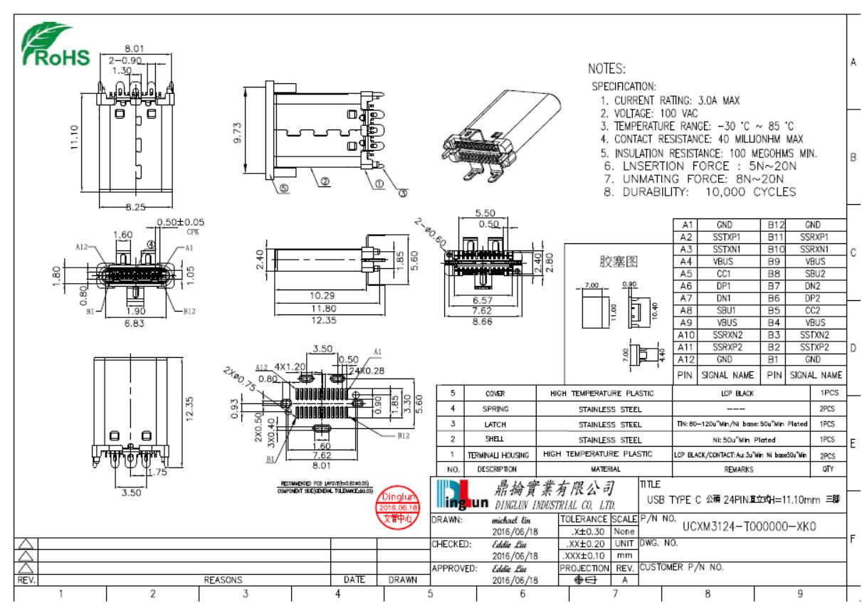 USB 3.1 TYPE C公頭24P立式貼片H=11.1mm高三腳插板 180度SMT
