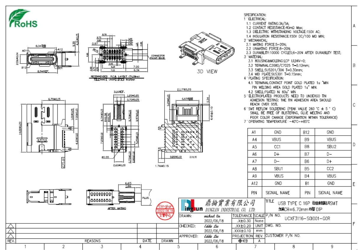 USB 3.1 TYPE C 16P母座側插貼片SMT加高CH=6.70mm四腳DIP