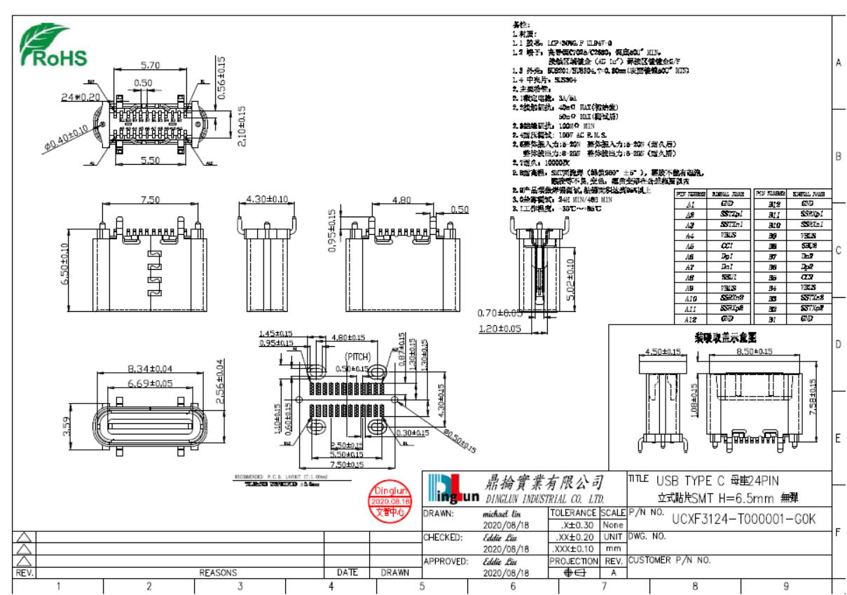 USB 3.1 TYPE C母座 24PIN 180度SMT四腳插板 H=6.5mm