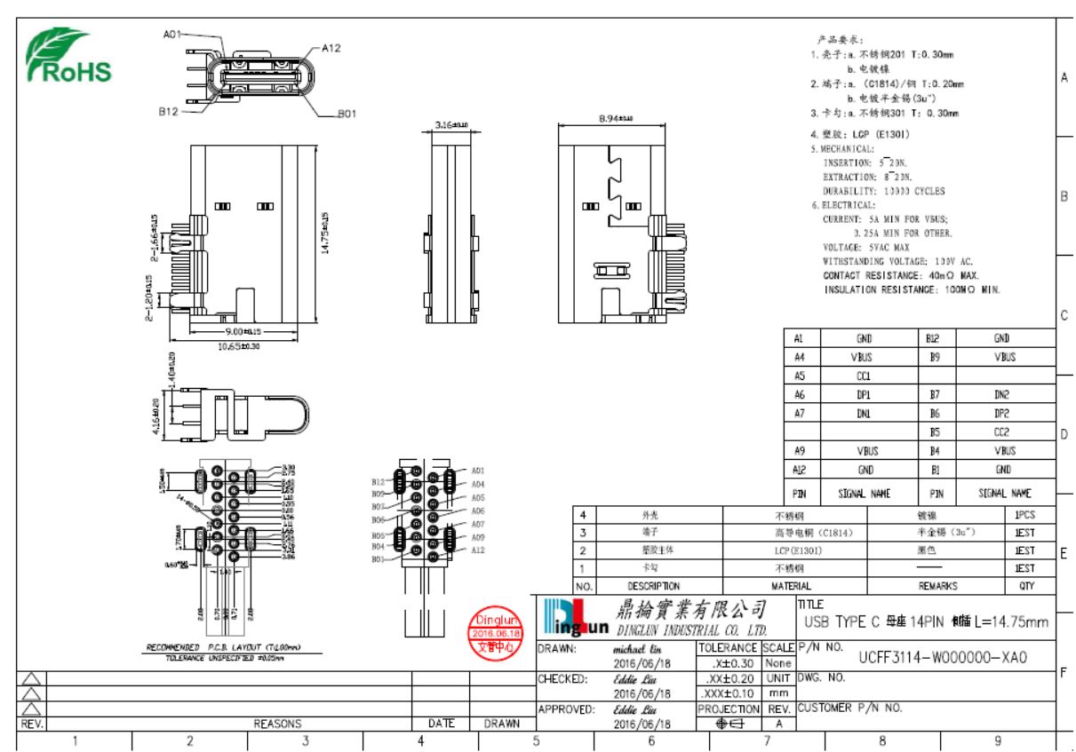 USB 3.1 TYPE C母座14P 90度側立式插板DIP L=14.75mm