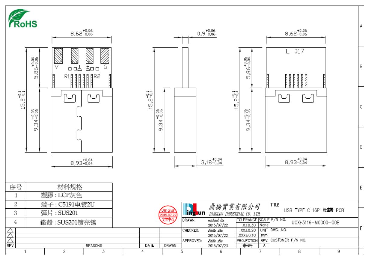 USB 3.1 TYPE C 16P 母座帶PCB板