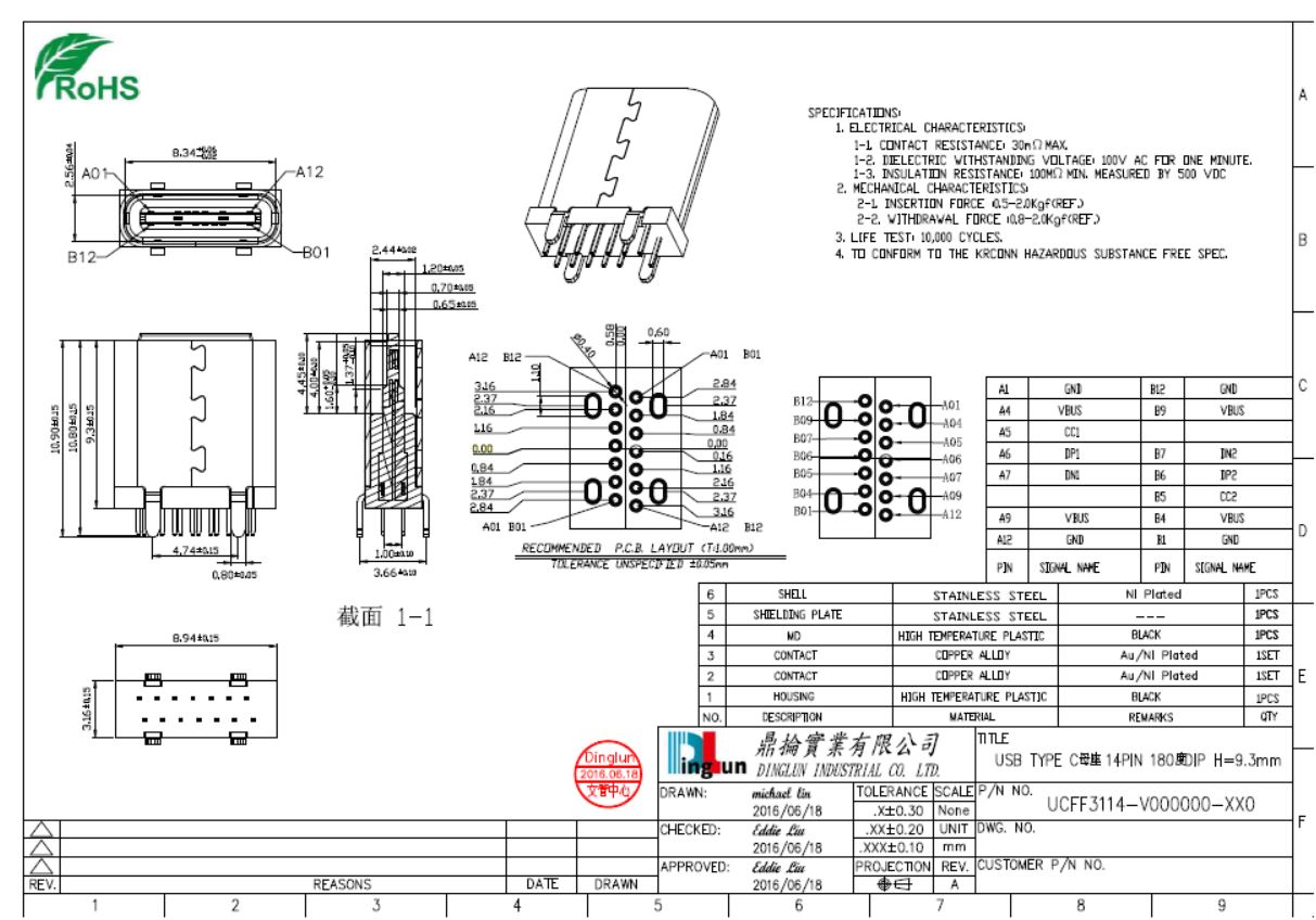 USB TYPE C 母座14PIN 180度DIP H=9.3mm
