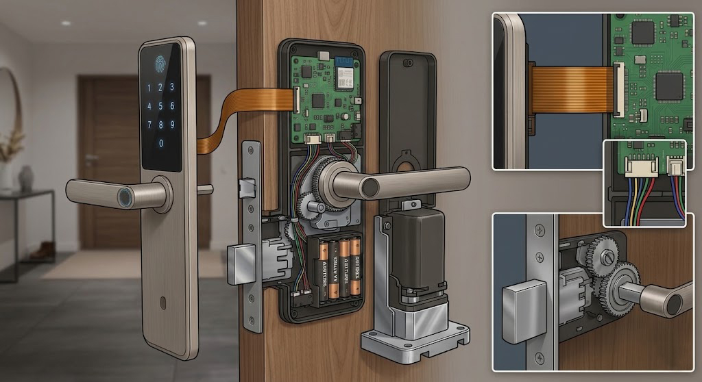 智慧門鎖(Smart Door Lock)內部空間狹小且功能模組眾多,因此需要多種不同規格的連接器與線材來串接動力、感測及控制訊號。