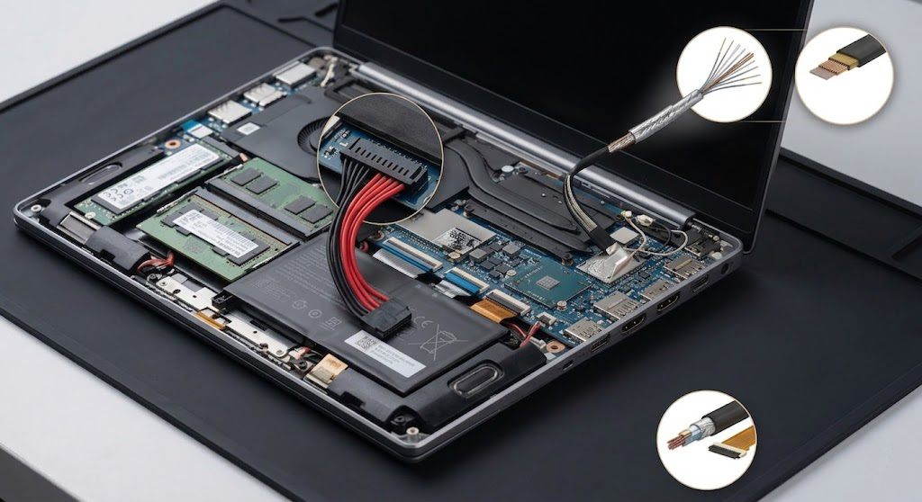 線材在筆電內部扮演了電流與訊號的橋樑: