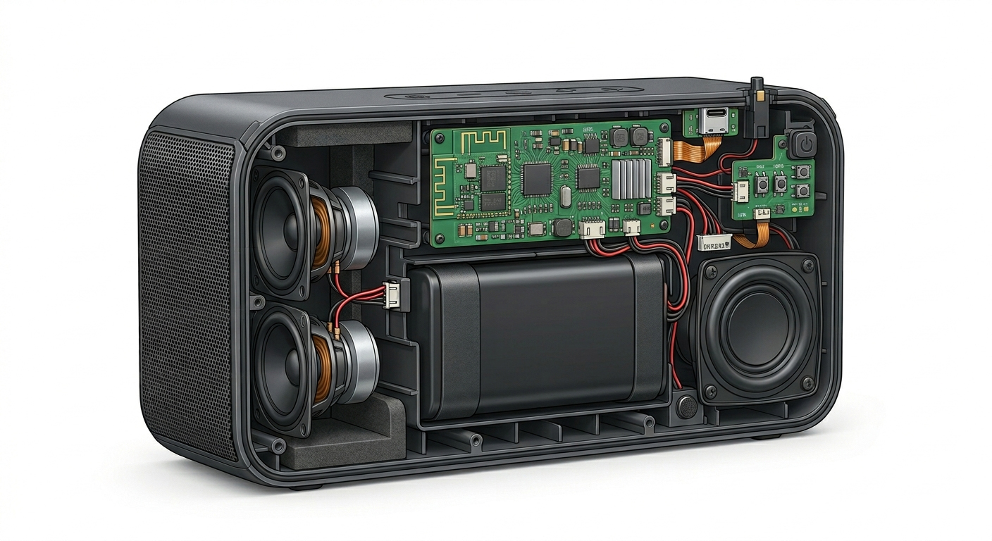 藍牙喇叭內部的設計精巧,為了在有限的空間內達成電源管理、音訊處理及驅動單體發聲,會使用多種特定類型的連接器與線材。